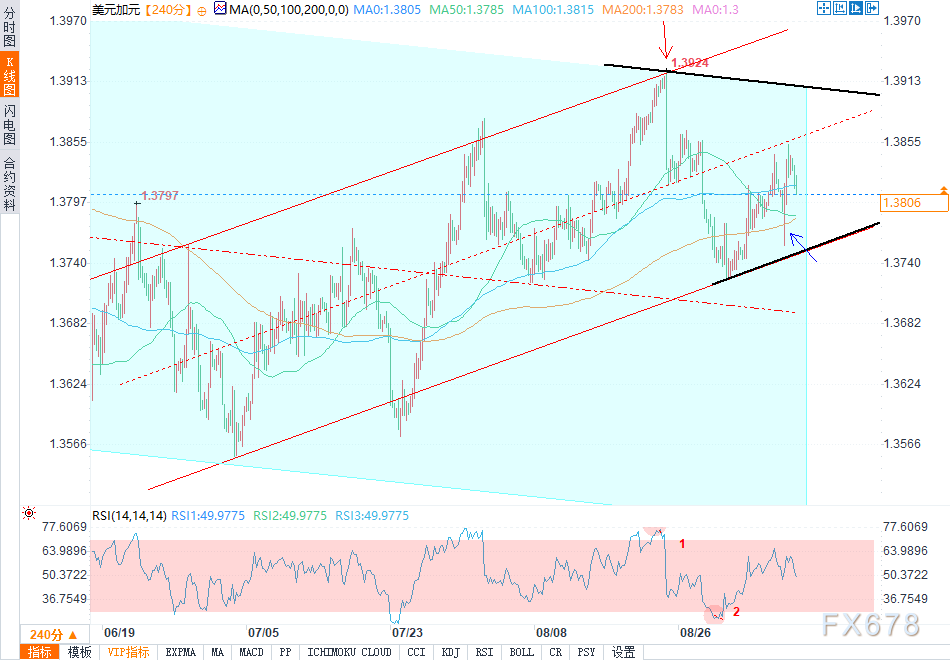 中期视角:自7月起,汇率从1.3550-1.3600支撑区间反弹,形成红色上升通道。